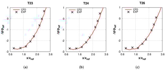 Compressor pressure at casing for the operating points experimentally tested: (a) T23 (MEL), (b) T24, (c) T26.