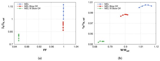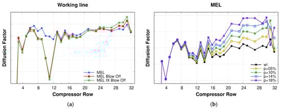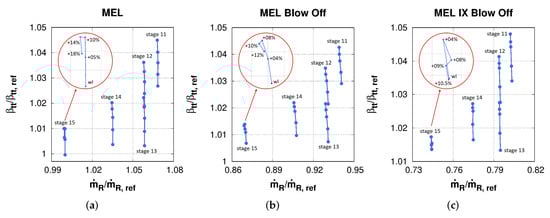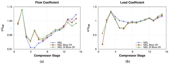 Therefore, with these two strategies (MEL blow-off and MEL IX blow-off), there is a reduction in the load in the first part of the compressor (rows 6–24) and then an increase in the load in the last three stages, as confirmed by Figure 6b.