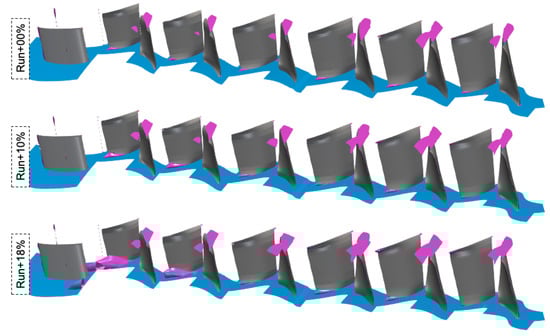 Recirculation regions close to the compressor endwall for the stages from 10 to 15 with OGV are reported in Figure 10. They suggest that if the hub corner separation is assumed to be most relevant source of instability, the stall mechanism does not change for the three operating conditions. Considering the stage 15 characteristic (Figure 9), the numerical stability margin for MEL, IX, and IX blow-off operating conditions, respectively, is progressively reduced. Such observation is in agreement with the stage 15 diffusion factor at the working point (Figure 7a) which for IX and IX with blow-off operating conditions is progressively higher compared to the value assumed in the MEL condition.