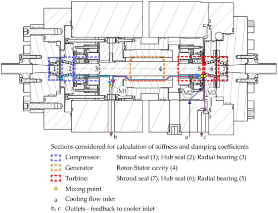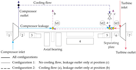 Simplified scheme of CO2 two configurations of flow paths inside sCO2-HeRoM TAC with labyrinth seals 1, 2, 6, 7, radial magnetic bearing clearance 3, 5 and generator cavity 4 (colors according to Figure 1).