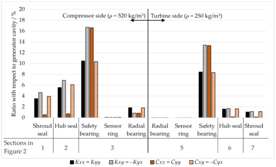 As this paper relates to the AMB used in sCO2-HeRoM TAC, windage losses, axial thrust and the cooling effect of sCO2 calculated with in-house code are not discussed in detail. The focus lies on the radial deflection of the rotor and radial forces in the bearings. These are caused by forces on the rotor due to imbalance and rotationally asymmetric pressure fields around the rotor. The latter occurs in the impellers and in the rotor–stator cavities. The rotor–stator cavities are the labyrinth seals and cavities in the manner of cylindrical shells such as the journal bearings (safety bearings, sensor rings, radial bearings) and the generator cavity. In the radial bearing, the space between the electromagnets is closed similar to the journal bearing shown by Jin et al. [7] to obtain a nearly cylindrical surface and avoid large forces caused by irregular geometry reported by Kim et al. [5]. To account for the forces (F) in the rotordynamics analysis, equivalent stiffness (K) and damping coefficients (C) are used together with deflection x and y (see Equation (1)). These are calculated using the commercially available tool xLRotor [11] for different sections indicated in Figure 2. For labyrinth seals, a model designed for a compressible gas seal was used, while the other cavities were approximated as annular seals. Calculations of stiffness and damping coefficients were performed for sections in Figure 2 considering the pressure and density distribution along the flow path of sCO2 inside the TAC. However, a constant average density and viscosity was used as input for the annular seal model and the compressible gas seal model used a constant compressibility factor to account for fluid properties. Due to the small change of fluid properties within the annular cavities and relatively little pressure difference across the seals, the deviations caused by the inaccuracy of fluid properties are considered to be limited. They reveal that all cavities considered have a destabilizing effect, i.e., the forces of the fluid act on the rotor in a direction that increases the deflection of the rotor. Considering flow path configuration 1, Figure 4 shows the results of an example calculation. Coefficients of the different sections in Figure 2 are displayed as a fraction of those in the generator cavity (4). Note that sections (3) and (5) are divided into the different elements of the radial bearing, safety bearing, sensor ring and the radial bearing itself. According to Figure 4, the generator cavity (4) dominates the rotordynamic influence of the sCO2 compared to the other cavities. Coefficients are at least six-times larger for cross-coupled stiffness and direct damping and almost 10-times higher for direct stiffness and cross-coupled damping . The reason for the dominance of the generator cavity is the size of the cavity, which has twice the diameter and more than twice the length of the cavity in safety bearings. The latter has high coefficients because of a narrow radial gap width of only 0.08 mm. In addition, the liquid-like sCO2 causes larger coefficients for seals and bearings on the compressor side, even though those on the turbine side bear the same geometry. Since Figure 4 suggests that forces originating in the generator cavity are dominant over those in other cavities, particular attention is paid to the effect of density alterations inside this cavity on radial deflection and bearing forces.