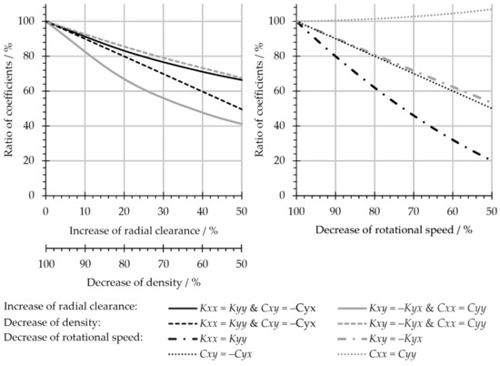 Ratio of stiffness and damping coefficients for decrease of rotational speed, increase of radial clearance and decrease of density in generator cavity of sCO2-HeRoM TAC.
