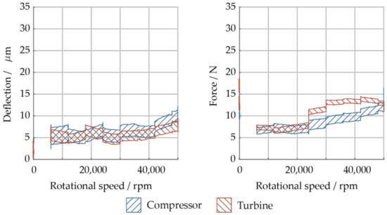 Deflection and forces at radial bearings on compressor and turbine side during air pre-tests for speeds ranging from 0 rpm to 50,000 rpm.