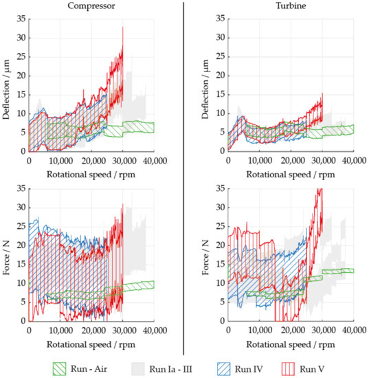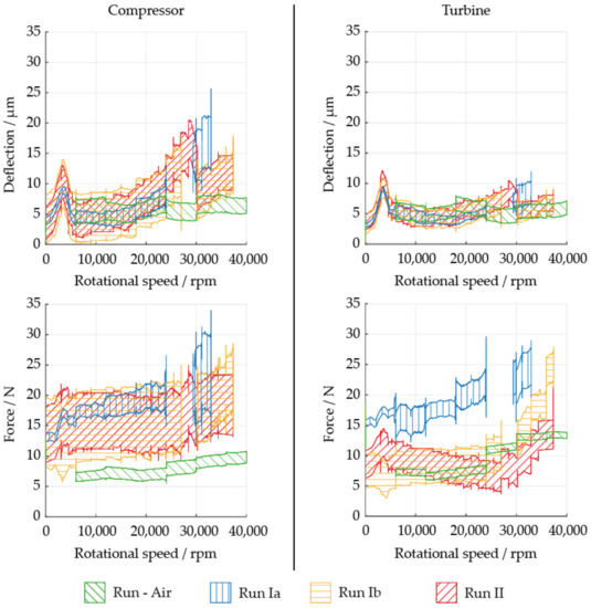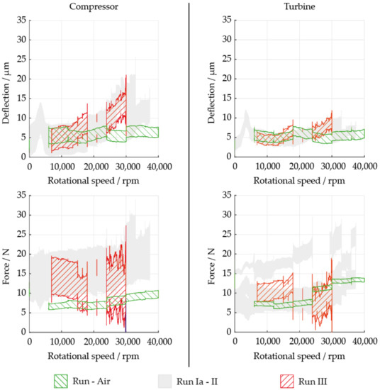 Deflections and forces depicted as function of speed for region I and II in Figure 6 for three test runs compared to the air test: (top) deflections; (bottom) forces; (left) at compressor bearing; (right) at turbine bearing.