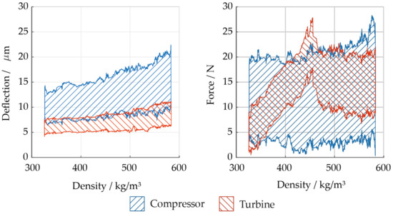 Deflection of the rotor and radial force of the bearings on turbine and compressor side over compressor inlet density at constant rotational speed of 25,000 rpm: (left) deflection; (right) radial force.