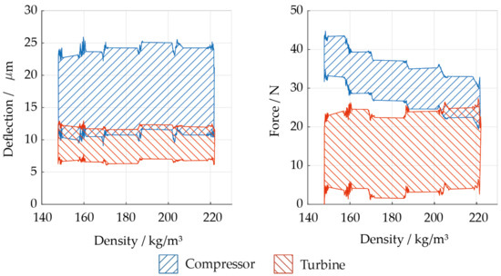 Deflection of the rotor and radial force of the bearings on turbine and compressor over density inside generator cavity at constant rotational speed of 27,500 rpm: (left) deflection; (right) force.