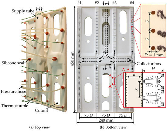 Cooling air enters the panel from a supply tube and flows into a collector box, which is schematically illustrated in Figure 1. From the collector box, the air gets separated into four tubes with an inner diameter of , while denotes the diameter of the holes on the bottom side of the tubes. The tubes are arranged in a distance of to each other. Table 1 gives an overview of the number of holes N and their distance S for each tube. The air exits the panel via these holes and creates 200 impinging jets onto a flat target plate in a distance of .