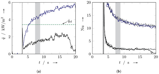 Figure 5 shows the transient results of the specific heat flux from Equation (2) and the Nusselt number from Equation (7) for the two pixels, which were exemplarily discussed in Figure 4.