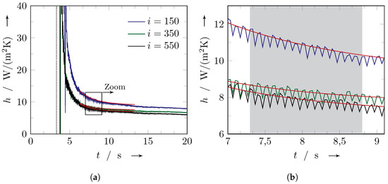 Transient results for the heat transfer coefficient due to natural convection including the modeled polynomial functions from Equation (10) (red lines): (a) Results for three pixel heights i; (b) Zoom into the region of interest.