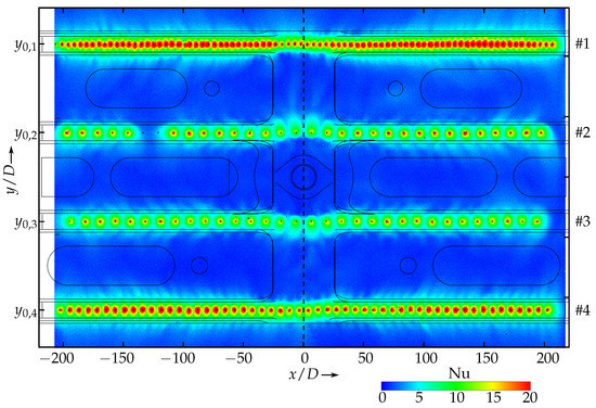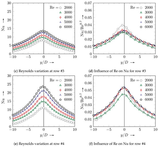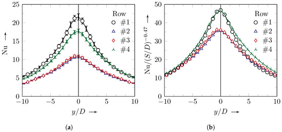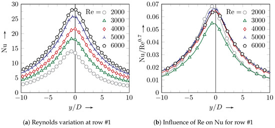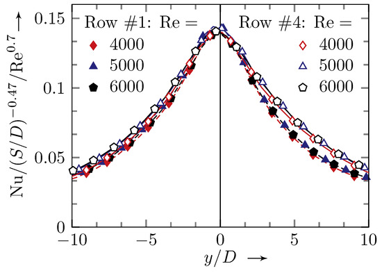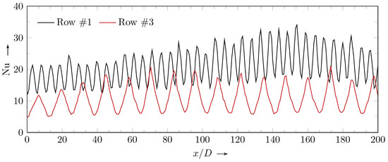 For a better quantification of the local Nusselt number, in Figure 8 the results along the centerlines of row and are given exemplarily to one side at . Each value corresponds to an average over 3 pixel in y-direction (≈2.1 D).