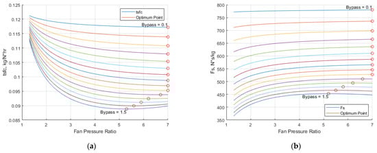 Plots of the optimum FPR with BPR increasing with each line for (a) minimizing TSFC and (b) maximizing Fs.