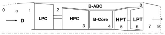 Following the compression of the stream in the LPC, the stream diverges into two streams: the core stream and the auxiliary stream. The bypass ratio is defined in Equation (A8). The auxiliary stream bypasses the core of the engine and enters the auxiliary combustion chamber, while the core stream is compressed further through the stages of the HPC. The combustion process of the auxiliary combustion chamber will produce products of combustion at 2516 K. The loss in stagnation pressure in this combustion process is calculated in Equation (A9).