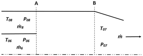Figure 4 represents the mixing duct where the two streams will fully mix before exiting as one stream. Station A is the inlet to the mixing duct where the bypass stream coming from the auxiliary combustion chamber and the core stream coming from the LPT. Station B is the outlet of the mixing duct where the combined stream will enter the nozzle.
