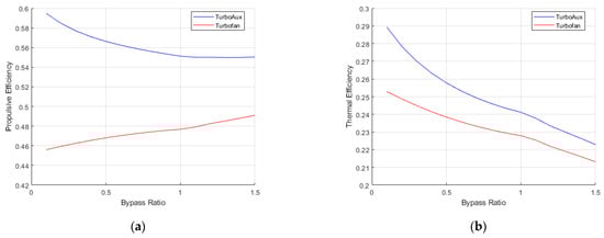 Plots of efficiency vs. bypass ratio (a) propulsive and (b) thermal efficiency.