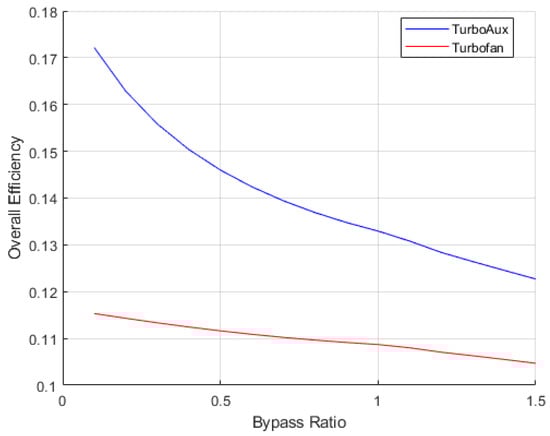 The performance efficiencies of turbofan and TurboAux engines in terms of (i) propulsive efficiency, (ii) thermal efficiency, and (iii) overall efficiency are shown in Figure 5 and Figure 6. Similarly, the performance of these engines in terms of specific thrust and TSFC is shown in Figure 7. The figures show how these performance parameters vary across each BPR-FPR configuration. It is important to note that these parameters are not only affected by BPR, but rather by the optimal BPR-FPR configuration combination that was obtained from the optimization analysis.