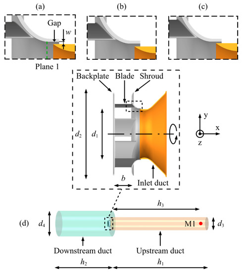 The baseline fan (Case 1) and the two different designs (Case 2 and Case 3) are illustrated in Figure 1. Case 1 is the same fan as the one examined in [8]. The fan geometry is the same for all three cases, meaning that the blades, shroud, and backplate are the same. There are seven blades in the fan. A clearance (i.e., the gap) is located between the stationary (brown) and rotating parts (gray). Case 2 has larger gap width (wcase2), and Case 3 has smaller gap width (wcase3) than Case 1. The gap width is varied by changing the wall thickness of the inlet duct. The rounded edge of the inlet duct is shorted for Case 2 and extended for Case 3. The inlet duct is moved in the axial direction for the different cases so that the axial overlap between the fan shroud and the inlet duct is the same for all cases. As shown in Figure 1d, the fan and inlet duct are placed in a downstream duct, and the inlet duct is connected to an upstream duct. This simple geometry layout is designed for the numerical simulations. This simplification reduces the geometry complexity but retains the principal flow and acoustic characteristics. The fan and case parameters are listed in Table 1. Here, d1 is the fan intake diameter at the BLE, and d2 is the fan diameter at the blade trailing edge. For the downstream duct, h2 denotes the duct length and d4 the outlet diameter. For the upstream duct, h1 is the duct length and d3 the inlet diameter. In addition, h3 is the distance between the inlet duct and the microphone M1.