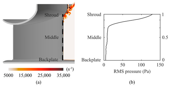 The contours of vorticity magnitudes at the blade leading edge for Case 1 is shown in Figure 3a. There are regions with high vorticity magnitude upstream of the BLE. Here, the BLE is marked out with a dashed line. They are generated when the gap flow is mixed with the main flow. This phenomenon was also observed in previous studies [8,20]. The black dashed line is a monitoring line positioned at the BLE of one blade, and it extends from the backplate to the shroud. The monitoring line follows the blade as the fan rotates, and the wall pressure is monitored for 12 fan revolutions. The root mean square (RMS) of the wall pressure fluctuations is shown in Figure 3b. At the position nearest the shroud, the RMS has its highest value. As the distance to the shroud increases, the pressure RMS value decays. At the backplate, the pressure RMS value is 5 Pa, which is approximately 4% of the value at the shroud (129 Pa).