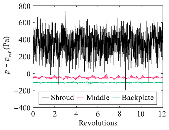 The time history of the wall pressure at the monitoring line is shown in Figure 4. At the position on the shroud, the pressure fluctuates with large amplitudes and high frequencies. As the distance from the shroud increases, the amplitudes of pressure fluctuations decrease. Small fluctuations are observed at the middle position. At the backplate, fluctuations are almost negligible.