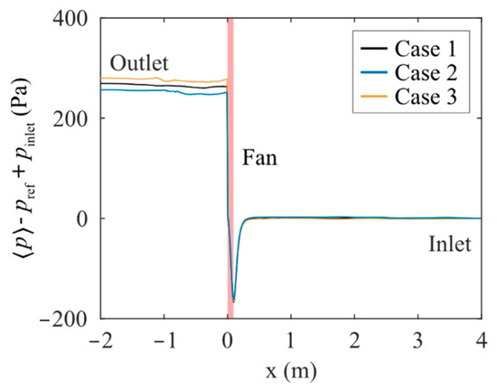 The pressure along the axial axis of the fan across the computational domain. Here, x = −2 corresponds to the location near the outlet and x = 4 near the inlet. The fan location is marked out with the red zone.