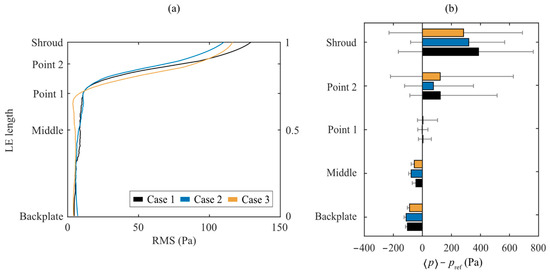 Pressure at BLE. (a) The RMS of the pressure fluctuations for 12 fan revolutions, on one blade at the monitoring line; (b) the time-average pressure and error bars showing the minimum and maximum pressure.