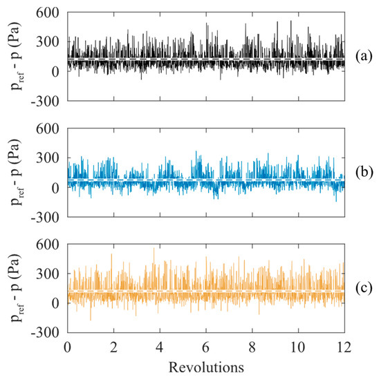 Figure 8 shows the time history of the wall pressure for all cases at point 2 during 12 fan periods. The dashed lines indicate the average value for each case, and as illustrated in Figure 7b, it is lowest for Case 2. For Cases 1 and 3, pressure fluctuations with large amplitudes and high frequencies are observed. Fluctuations are also obvious for Case 2, but the amplitudes are smaller. Moreover, a periodic low-frequency fluctuation in relation to the fan rotation is seen for Case 2, which was also found in [21]. For Cases 1 and 3, there is no clear periodic low-frequency fluctuation. For all the cases, the maximum absolute values of the positive fluctuations are larger than those of the negative fluctuations. The reason is due to the upstream turbulent vortex impingement.