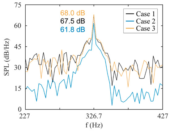 In the previous studies of Case 1 where the numerical prediction was compared with experimental data [17,21], it was shown that SPL at was best-predicted upstream of the fan. The SPL predicted upstream of the fan (microphone M1) for the tonal frequency is compared between the cases in Figure 10. Case 1 and 3 have almost the same amplitude. The lowest amplitude has Case 2, where the level decreased by 5.7 dB compared with Case 1. These results agree with the results from Figure 7, Figure 8 and Figure 9, where Case 2 had the lowest wall pressure on the BLE.