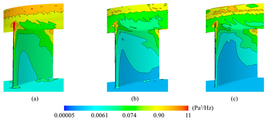 Based on the band-filtered power spectral density(PSD) of the wall pressure fluctuations, the location and magnitudes of dominant tonal noise sources are evaluated. The results at the tonal frequency (326.7 Hz) are illustrated in Figure 5. The PSD is calculated using the von Hann window for 3000 samples per signal section, which leads to a frequency resolution of around 3 Hz. The signal sections do not overlap each other. The location of the highest wall pressure fluctuations is at the same position (the BLE close to the shroud) as the region with high vorticity magnitudes, high-pressure RMS value, and largest pressure fluctuation. Hence, the interaction between inlet-gap turbulence and the BLE is responsible for the tonal noise generation. This was also found for Case 1 in a previous study [8]. This approach is therefore selected when the three cases are compared in the following analysis.