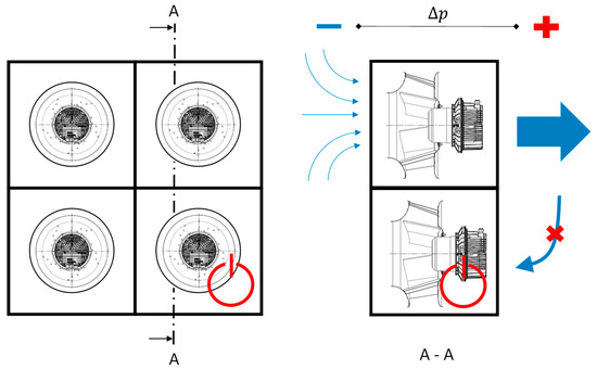 For the sake of illustration of our method and without loss of generality, we consider a 2 × 2 fan array consisting of four identical centrifugal fans as depicted in Figure 4: