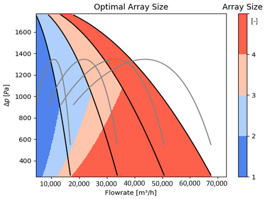 In order to make the findings more tangible, we omit a non-dimensional presentation and use dimensional values of ebmpapst’s R3G500 centrifugal fan. Applying our method to this 2 × 2 array yields the result in Figure 5 for the operating map of the array where the color bar indicates the number of active fans in the array: