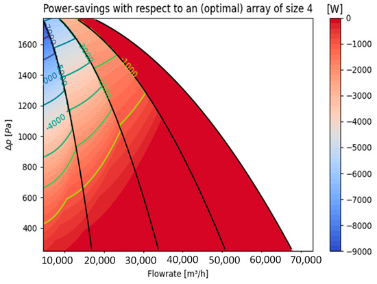 Additionally, as can be intuitively expected, there is no potential of shutting down any fans in the overload area of the fan array, i.e., in operating points where the full volume flow rate of the array is needed.