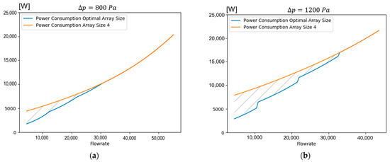 Comparison of the power consumption with and without shutdown of fans: (a) for constant pressure of 800 Pa; (b) for constant pressure level of 1200 Pa.