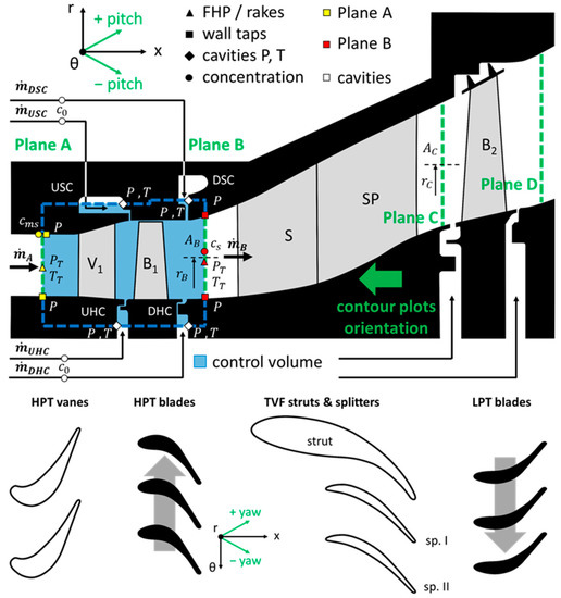 The test setup considered for this study is a two-stage turbine, with the cross-section and meridional view reported in Figure 2. It is constituted by an HPT stage, an intermediate turbine duct with turning vanes and splitter, called the Turbine Vane Frame (TVF), and an LPT counter-rotating blade row. The arrangement is representative of the last HPT stage and first LPT stage in a state-of-the-art turbofan engine, and it includes six purged stator-rotor cavities: four in the HPT stage and two in the LPT stage. The HPT and LPT hub cavities are engine-relevant radial-clearance rim seals, while the shroud cavities are circumferentially continuous axial slots. Out of the whole assembly depicted in Figure 2, this investigation focuses its attention on the HPT side, in particular on the blue, dash-contoured control volume. The control volume is bounded radially by the position of the HPT cavity instrumentation and axially by two measurement planes: the HPT inlet plane (Plane A) and the HPT outlet plane (Plane B). The detailed description of the measurement apparatus in the control volume is postponed to the Section 3.