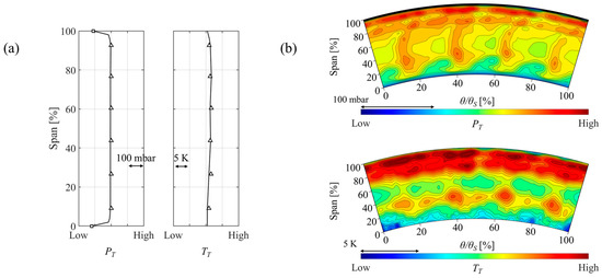 Plane B total pressure and total temperature are acquired with a Five-Hole Probe (FHP). The FHP was manufactured and calibrated at the Institute of Jet Propulsion and Turbomachinery (RWTH Aachen University). The head is inclined 90° from the stem axis and is integrated with a shielded, calibrated type K thermocouple. The 30 values at 5 Hz for each measurement point are acquired with a NetScanner 9116 Pressure Scanner (pressure lines) and a NI 9214 Temperature Input Module (thermocouple), for a combined uncertainty of ±3 mbar and ±0.8 K, respectively. During the experimental tests, the probe is traversed across a 20 × 60 measurement grid (radial × tangential), which covers a 1 TVF pitch and approximately 90% of the channel height in Plane B. The data from the FHP is complemented by boundary layer rakes readings (hub and shroud rakes, six heads each) and wall taps (hub and shroud walls, seven taps each), while the boundary layer profile is obtained from a RANS simulation of the HPT stage using experimental boundary conditions. The resulting and contour plots are depicted in Figure 3b.
