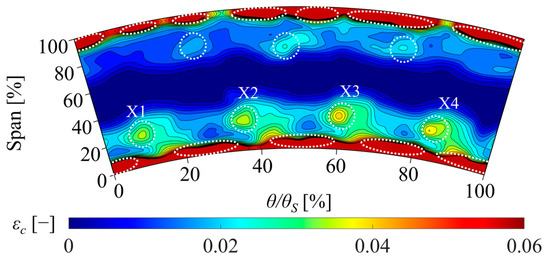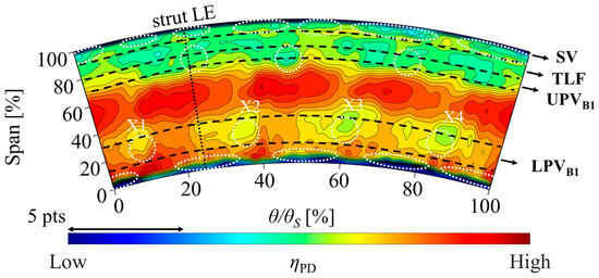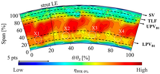 Figure 7 displays the efficiency contour plot for the PFR 0% case. The black dashed lines and the white dotted circles indicate the position of the secondary flow structures and of the high-effectiveness spots in the PFR 100% case to help visualize the changes of such features between the two operating conditions. The midspan, high-efficiency core flow region appears to be wider in the case without purge (from 30% Span to 75% Span). The low-efficiency adjacent bands, corresponding to LPVB1-LPVV1 and UPVB1-TLF-SV, are instead confined to narrower corridors, closer to the endwalls (Span < 30% and Span > 75%, respectively). Moreover, in the PFR 0% case, the low-efficiency lobes X1–X4 all appear circumferentially shifted against the direction of rotation of the HPT blades due to a yaw angle decrease of about 5° in the region of such flow features, calculated using the FHP data. This is a direct consequence of the HPT purge absence, already observed by Sterzinger et al. [19], at the outlet of a similar stage.