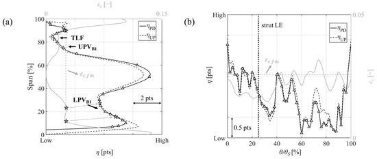 For a more quantitative analysis, the mass-averaged radial profiles of and are reported in Figure 8a (black solid lines and black dashed lines, respectively), together with the radial distribution of (grey line). The PD efficiency definition is utilized for , while and converge into Equation (7) for . Interestingly, Figure 8a shows that peak core flow efficiency is basically the same for and : the difference lies in the radial extension of the core flow band, unperturbed by LPVB1 and UPVB1. In agreement with the existing literature (Regina et al. [6] and Zerobin et al. [20], among others), the upstream hub purge is entrained in LPVB1 and UPVB1, intensifying and pushing them toward midspan. In Figure 8a, the LPVB1 magnitude and position change between the cases leads to local efficiency deviations up to 2 pts in favor of , and to a radial offset of about 10% Span. This trend is still recognizable but less pronounced for UPVB1, possibly due to the presence of the TLF, which increases the dilution of the purge air in the annulus gas, smearing out its effect. At the same time, the upstream shroud purge seems to partially suppress the TLF-related losses, producing experimental evidence for the numerical findings of Zlatinov et al. [8]. Finally, it is quite surprising to see that at approximately 90% Span and 10% Span. This is explained by the action of the downstream purge, which in Plane B is concentrated in the near-endwall regions of the channel (Span > 90% and Span < 10%). In fact, the downstream purge, in combination with the rotor passage vortices radial migration, forces a redistribution of the annulus flow (see the peaks in the curve at 15% Span and 85% Span). The outcome is that venae of mainstream, high-performance fluid are enclosed between the rotor passage vortices and the endwalls. Such a phenomenon, clearly recognizable also in Figure 5 at 15% Span, disappears in the absence of purge. The explanation above would also justify why, to the authors’ knowledge, such spots have never been described in the open literature, which mostly focuses on partially purged HPT stages, especially with upstream hub purge only.