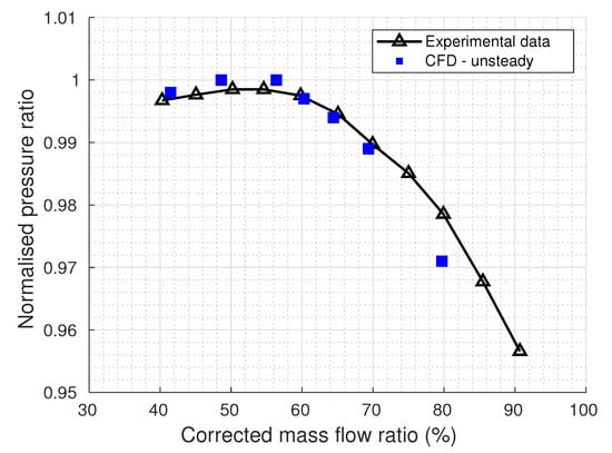 Stagnation conditions are uniformly applied to the inlet section. This method imposes the total pressure, temperature and flow direction and calculates other quantities using the isentropic relations. A study from Kulak et al. [16] demonstrated that a mass flow boundary condition tends to over-stabilise the flow and, thus, stifles initiations of instabilities. Furthermore, a uniform static pressure outlet condition prevents one from reaching a lower mass flow than the highest of the zero slope section. Hence, all the simulations in this study used a throttle law as an outlet condition.