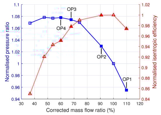 Studied operating points’ locations on the compressor characteristic.