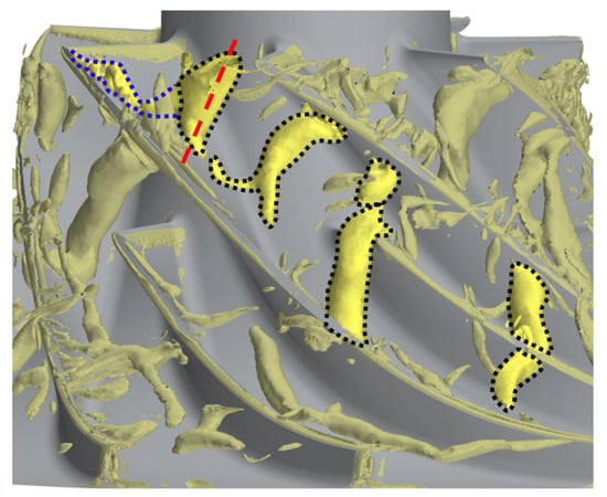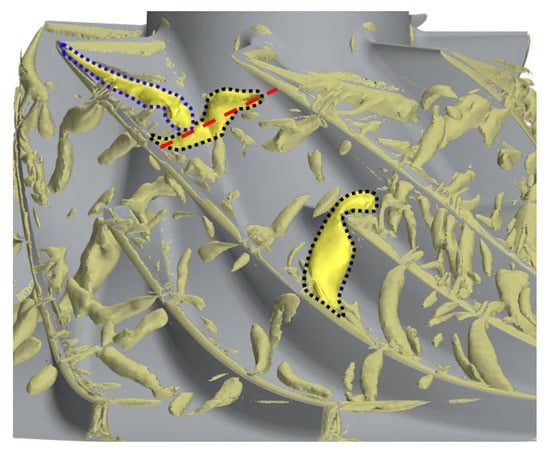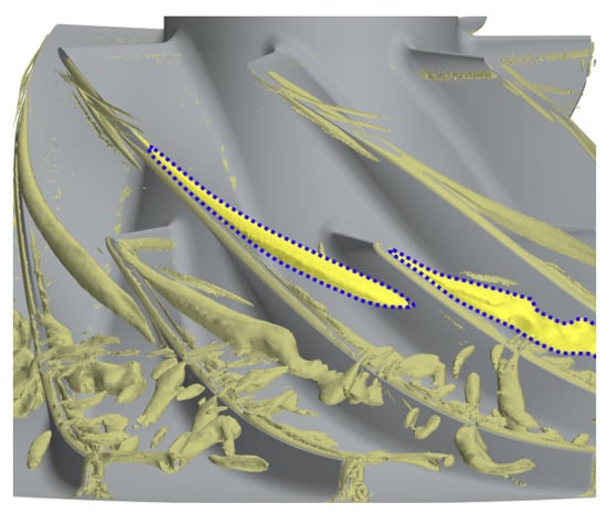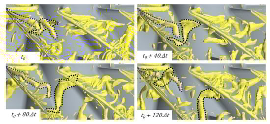 With the decrease in the mass flow rate, the present compressor reaches the operating point, OP3, in which the TLV rolls up earlier near the main blade’s leading edge and becomes shorter than those observed at OP2. According to Tan et al. [19], the angle defining the tip leakage vortex’s trajectory from the main blade suction side increases with the blade loading. Furthermore, as reported by Zhang et al. [20], the reverse tip clearance flow at the impeller’s outlet extends further upstream until it reaches a meridional position of . Figure 7 shows that at this operating point, some notable vortices emerge in front of the TLV tail before propagating in the passage. The upstream extremities of the released vortices are slightly oriented upstream, while the lower extremities remain attached to the blade’s suction side. In this way, these large structures, oriented perpendicular to the streamwise direction, propagate downstream until they hit the splitter blades’ leading edges. Moreover, this phenomenon proves to be periodic, and for the present mass flow rate, those vortices strike the splitter blade’s leading edge approximately once per revolution. During the oncoming flow, these vortex tubes occurring at occupy around the of the span. Such vortices are highly similar to flow structures arising from the tip leakage flow breakdown described by Cao et al. [10]. However, the present case shows the coexistence of these wide vortices with an established tip leakage vortex.