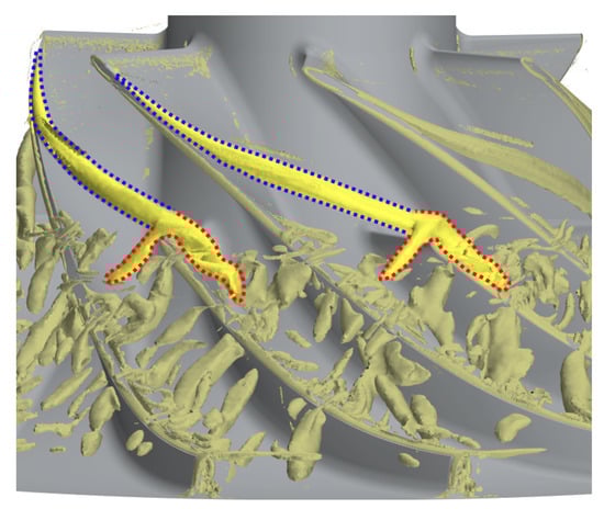 Bousquet et al. [9] observed similar vortex shedding at the leading edge of a centrifugal compressor with a vaned diffuser without a volute in near-stall conditions. The interaction between the leading edge separation and the incoming flow resulted in a Kelvin–Helmholtz instability inducing the tornado vortex shedding. However, in this configuration, the vortices’ trajectory was such that no short length-scale rotating disturbances were observed. More recently, a similar Kelvin–Helmholtz mechanism was mentioned by Cao et al. [10] to explain the onset of massive vortex shedding from a tip leakage flow breakdown process close to the leading edges. This numerical and experimental investigation of a centrifugal compressor with a vaneless diffuser and a volute outlines the emergence of vortex tubes that propagate circumferentially and that strongly interact with the next blade’s leading edge. The main difference between Bousquet et al.’s observations and those of Cao et al. is the direction of the vortical structures. Those mentioned by Cao are tubes oriented in the blade-to-blade direction and depend on the downstream pressure field imposed by the volute’s tongue. Such phenomena are reminiscent of the residuals of the broken main tip leakage vortex described by Iwakiri et al. [11] as a result of single-impeller simulations. Like the previous authors, Tomita et al. [12] linked these tip leakage flow instabilities to the degradation of the compressor performances. However, they also demonstrated that the tip leakage vortex breakdown can stabilise the flow field and increase the operating range at a low mass flow by accelerating the incoming flow near the hub, unaffected by the vortical structures.