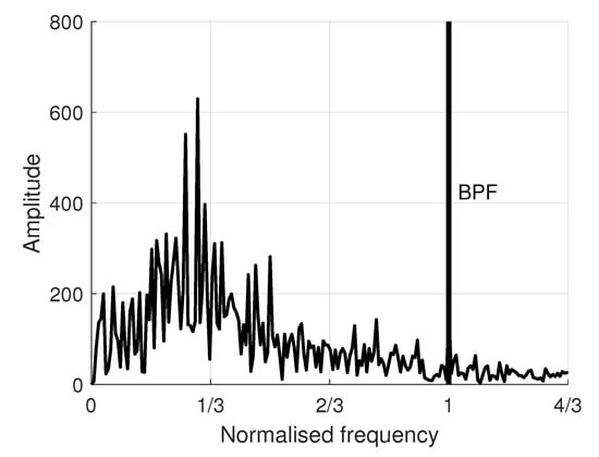 Previous works [2,4,5,6,21] on axial configurations have referred to these kinds of pre-stall disturbances as rotating instability. These instabilities are mainly encountered in compressors with wide tip clearances operating in near-stall conditions. As reported by Day [22], they are defined by their small size (about one pitch), low-pressure spots moving from the suction of a blade to the pressure side of the next one, and by a characteristic hump (about one-third of the blade’s passing frequency) on frequency spectra. A Fourier transform has been performed on the pressure signal recorded by a fixed probe located at to identify the present instabilities. Figure 10 shows the related frequency spectrum in which abscissa has been normalised by the main blade’s passing frequency (BPF). A distinctive hump is observed around one-third of the BPF, strengthening the rotating instability assumption. The discrete peak located just under one-third of the BPF is related to the passage of the vortex tubes that propagate circumferentially close to the leading edges.