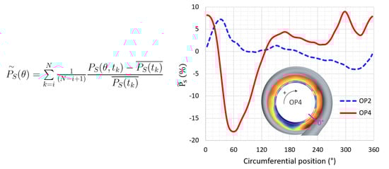 Some passages are ahead of the instabilities development. Indeed, passages coexist simultaneously with collapsed tip leakage vortices and ones with stable TLV in the impeller. The passages with broken TLV were noted to be associated with large vortical structures aligned with the leading edges’ plane. In contrast, the passages linked to unbroken TLV contain thin structures that roll up further downstream. This last flow topology is similar to the flow field observed at a higher mass flow rate when the compressor operates at OP3. This phenomenon is due to the non-uniformity of the pressure distribution induced by the volute in the vaneless diffuser. The asymmetry of the volute leads to a high-pressure region in front of the volute’s tongue, followed by a low-pressure zone. Figure 11 outlines the non-uniformity of the flow field in the vaneless diffuser by plotting the time-averaged static pressure variations, , around the impeller, where is the static pressure in the vaneless diffuser at and is the circumferential average of .
