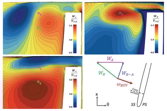 To compare the present flow field (at OP3) with the one analysed by the Baltimore research team, the relative velocity components around the tip leakage vortex are shown in Figure 12. The displayed components are expressed in the rotating frame (, , ) and are normalised by a reference blade speed defined as . In accordance with the analysis conducted by Chen et al. [14] on the axial configuration, Figure 12 reveals the coexistence of two distinct regions A and B around the tip leakage vortex. The first one, located near the TLV centre, is characterised by a high relative tangential velocity and a negative axial velocity . The second one is observed under the TLV and, contrary to the region A, has a low tangential component associated with a high axial component related to the blockage effect induced by the tip leakage vortex. Both have similar radial velocities, but there are significant radial gradients in and between the two zones. Figure 12 also outlines that the resulting relative velocity (between B and A) is parallel to the blade’s suction side. As the vorticity is defined by the curl of the velocity field, the resultant of the vorticity components around the shear layer is aligned perpendicular to the blade. Furthermore, distribution demonstrates that, in our case, the shear layer rolling up is probably caused by the influence of the upper reverse flow from the tip clearance and the forward main flow under it. This flow pattern, which is highly similar to the one highlighted by Chen, agrees with the vortical structures observed in the present centrifugal compressor. Therefore, from now on, the massive vortex tubes observed at OP3 and OP4 aligned perpendicular to the blade will be named “backflow vortices”.
