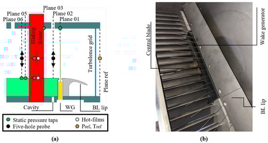 Sketchof the SPLEEN C1 cascade test setup with wake generator, including measurement planes and techniques (a). Picture of the cascade in the configuration relative to the current paper (b).