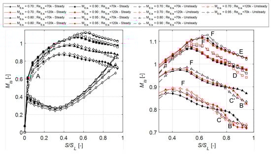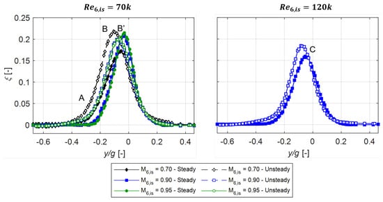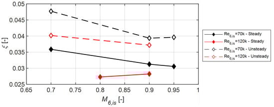 The pitchwise mass-averaged profile energy loss coefficient is presented in Figure 7. The losses are higher for the unsteady case at both Reynolds numbers. The loss evolution for high exit Mach numbers does not follow the increasing trend shown by Vera et al. [13], as reported in Ref. [22]. At k, the overall trend for Mach number variation is conserved with incoming wakes, as the losses decrease by increasing the exit Mach number. For the higher Reynolds number cases, the trend is inverted, as decreasing losses are measured as the exit Mach number increases with wakes.