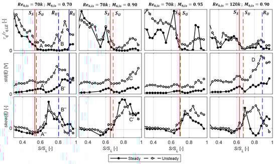 Hot-film sensors measurements were carried out to support the observations obtained by means of pressure measurements and to investigate the response of the blade aerodynamics to the periodic incoming wake disturbances. Figure 4 presents the time-mean averaged distribution of quasi-wall shear stress, sensor bridge voltage standard deviation, and skewness along the rear SS () for the four flow conditions tested with steady and unsteady inflow conditions. The quasi-wall shear stress of each case was normalized with the average value of the first sensor close to the blade leading edge on the SS. The locations of separation (S) and reattachment (R) reported in Table 4 are superimposed on the plots using solid and dashed lines for the steady and unsteady cases, respectively. The hot-film data analysis reported here was conducted according to the works of Howell et al. [8], Gomes et al. [31], Borner and Niehuis [32], and Clinkemaillie et al. [10]. The low exit Mach (k, left column in Figure 4) steady case is taken as a reference to compare with the literature and describe the evolution of the signals along the SS. The average value of drops to nearly-zero values at the location of separation (S) in (A), while the std(E) reaches a peak (A′). The separation region is characterized by low quasi-wall shear stress. According to Hodson [26], the may be non-zero in the region of unsteady separation since the heat-flux process is not sensitive to the flow direction. The skewness starts to decrease after the location of the peak velocity () as the end of the acceleration allows the transition process to start. Around the separation location, the skewness tends to cross the zero becoming positive (A″), indicating an increased presence of turbulent spots. The transition process is linked to an increase in and std(E) (B, B′). Following the std(E) growth, a local maximum identifies imminent reattachment, which is located at according to the pneumatic data. At this location, the skewness of the bridge voltage approaches zero (B″).