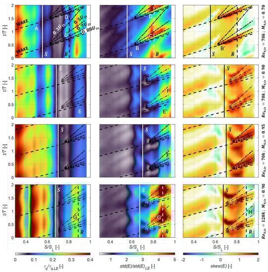 The two central rows in Figure 5 present the higher Mach number cases at k. The distribution of std(E) after the separation appears comparable to the lower Mach case. The wake-induced disturbances seem to respect the typical wedged shape, although they appear lower relative to the respective leading edge values. Contrarily to the case, the effect of the turbulent patch does not correlate to a relevant increase in quasi-wall shear stress following the passage of the wake and only a region of moderately higher with respect to the values at the separation onset (E). These observations correlate well with the impossibility of finding an indication of reattachment in the pneumatic pressure data for these two cases. The shift of the velocity peaks and separation locations occurring as the exit Mach number is increased was already identified in the data presented in Figure 3 and Figure 4 as a possible cause for the reduction of the wake capability to promote early reattachment. The T-S plots at exit Mach numbers 0.90 and 0.95 seem to support this hypothesis, showing regions of only moderately increased turbulent activity related to the wake passage pushed downstream on the SS (E′). The origin of the wake disturbance is located at , while it is pushed downstream to and at and 0.95, respectively. Moreover, the fraction of the wake passing period between the wake passage and the trailing edge of the becalmed region (0.30 ) at the location of the last sensor close to the TE reduces as the exit Mach number is increased (F, F′). If the effect of one wake passing event seems to spill into the next incoming wake at , occupying a period of , the wake influence is reduced to and at and , respectively. This is also a consequence of the increase in wake-reduced frequency associated with the decrease in exit flow velocity. The T-S diagrams of the higher Reynolds case (k) (Figure 5, lower row) are similar to the lower Reynolds number and lower Mach number case. Comparable wedge-shaped regions can be identified and, contrarily to the lower Reynolds number cases at the same exit Mach number, the increase in std(E) corresponds to a region of high quasi-wall shear stress (G, G′). This seems to confirm the presence of reattachment around this location, as suggested by the pressure measurements of Figure 3 and Table 4. The skew(E) T-S suggests that the higher exit Reynolds number appears to promote the presence of increased turbulent activity after the reattachment location (H). Consequently, increasing the exit Reynolds number seems to facilitate the wake-induced periodic reattachment process also at an exit Mach number of 0.90.