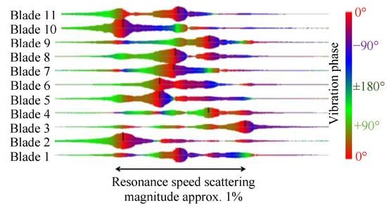 In a low EO resonance, in contrast to NR (nozzle ring) vane count-induced (EO > 20) higher eigenmodes, the excitation force will not be distributed equally over the circumferences but tends to concentrate at a few angular positions, such as around the turbine casing tongue or a highly clogged NR sector. To simplify the following discussion, a single dominant excitation angular position is assumed, for example, a completely clogged NR sector. With such an excitation force pattern, all low EO excitation force spatial phases will be locked to the position around the clogged NR sector. When the rotor sweeps through a resonance crossing, an individual blade reacts to the angularly fixed singular excitation force by alternating the vibratory phase from 0° (same phase as excitation) to +90° (resonance point) and +180° (“+” means, in this context, a lagging phase). Due to the mistuning, the vibratory phase alternation speed range differs between blades, so the IBPA will vary arbitrarily between 0 and ±180° (“+” means, in this context, running in the same direction as the rotor revolution). From these considerations, at least in the case of a radial turbine stage’s low EO resonances, usage of the technical term “nodal diameter” is not appropriate, so discussion should be restricted only to the IBPA. Additionally, the same “range” of IBPA will not cover the entire circumference but is confined to a few blade pairs. Note that it is a rather rare case that the IBPA will exactly fulfil the stepwise relation, , (: integer, a synonym of nodal diameter, and : Blade number).