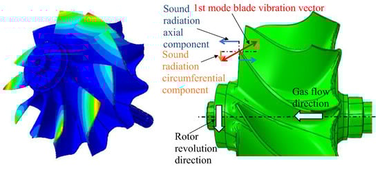 When dealing with the turbocharger’s turbine stage’s airborne acoustic field characteristics, it is indispensable to take bulk flow into account because the Mach number of relative flow velocity exceeds 0.5. As displayed in Figure 2, in the case of the turbocharger’s turbine stage’s first flap mode, a higher magnitude of sound radiation will be released downstream than in the circumferential direction.
