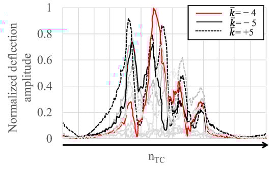 BTT nodal diameter trace output, normalized by the highest amplitude, resulted in = −4 (in the diagram, a trend of all values −5…+5 is included but highlighted only values used for further discussion).