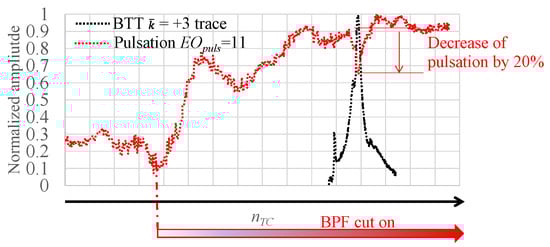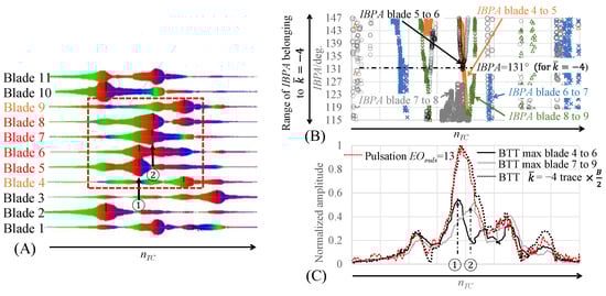 Figure 5C displays the same trend, which is already presented in [], but with additional information on individual blade trends. The pulsation amplitude trend along EOpuls = 13, obtained by FFT and order tracking analysis, matches almost perfectly the BTT trace trend. Around the speed range where the amplitude peak arises, the blade vibration amplitudes of Blades 5 and 6 or 7 and 8 were at comparable levels, and the IBPA between the set of Blades 5 and 6 or 7 and 8 met the prescribed value indeed for , i.e., 131°, refer to Figure 5B. If the IBPA values lie within the given y-axis “range“ (115–147 degrees), the peak amplitude of FFT decomposition corresponds to the energy contribution of .
